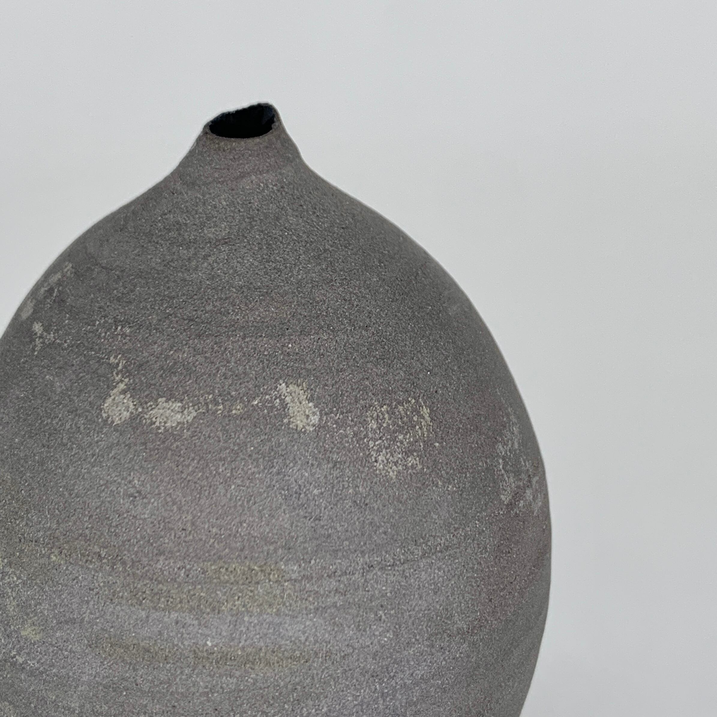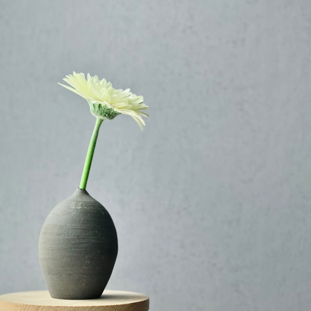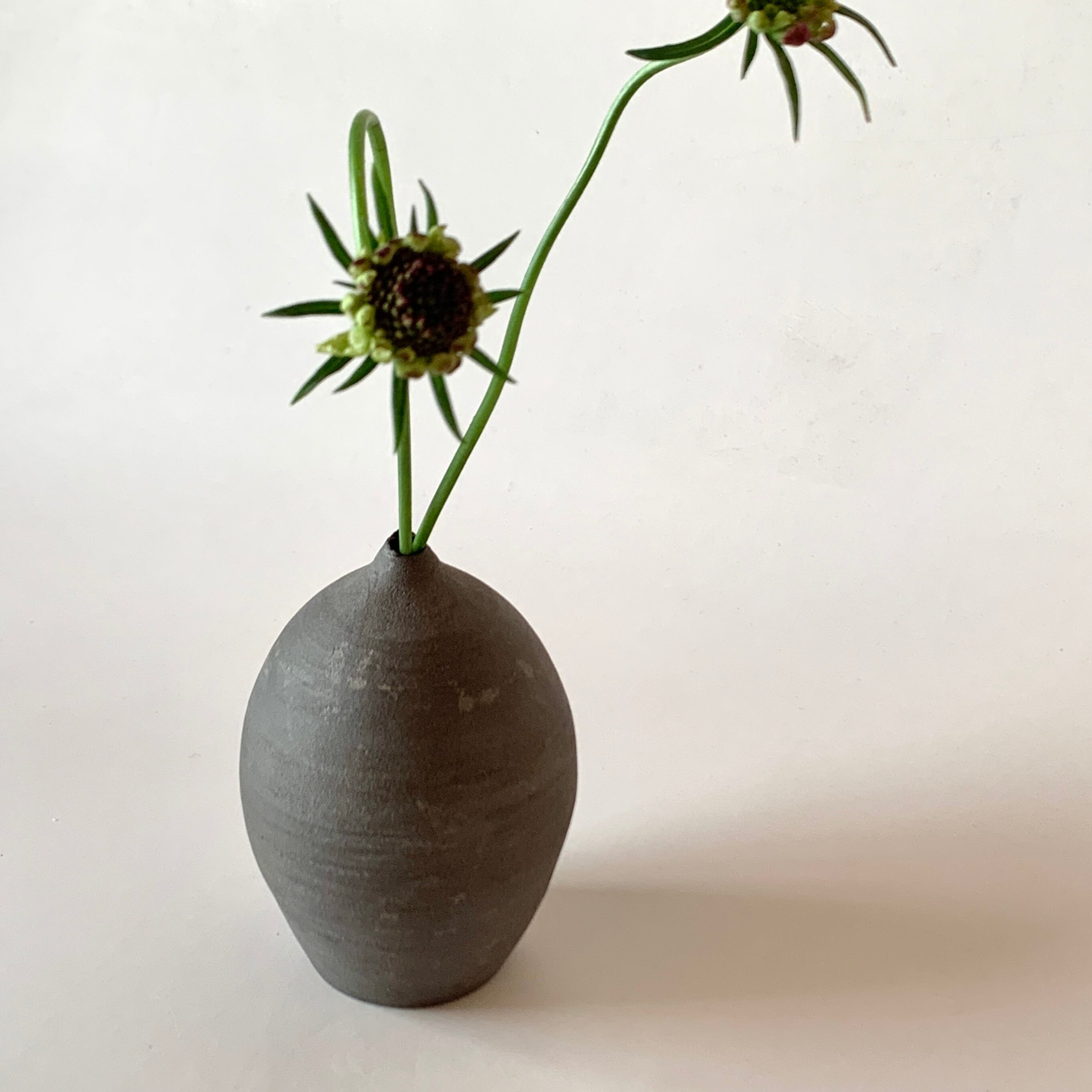 それ自体がコロンとしたタネで、丸さを強調するために極端に花器口が狭くなっているシンプルな一輪挿しです。