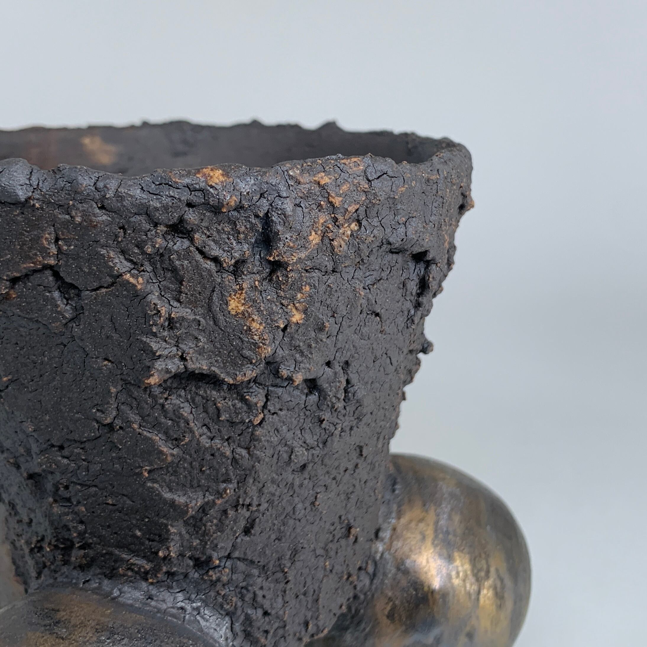 外側に原土を塗った本体は、その荒々しさと釉薬による焦げ茶色の濃淡で、味わい深い質感が生まれています。