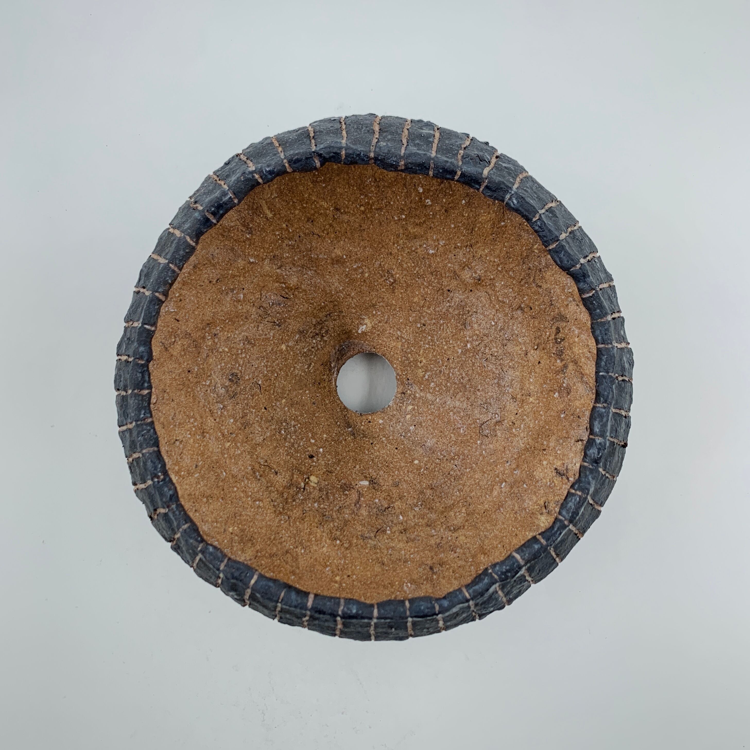 手びねりならではのゆらぎのあるシルエットや、内側とストライプの凹部分で窺える所々小石が飛び出して膨らむ様子、ザラついた原土らしい質感・色がポイントです。