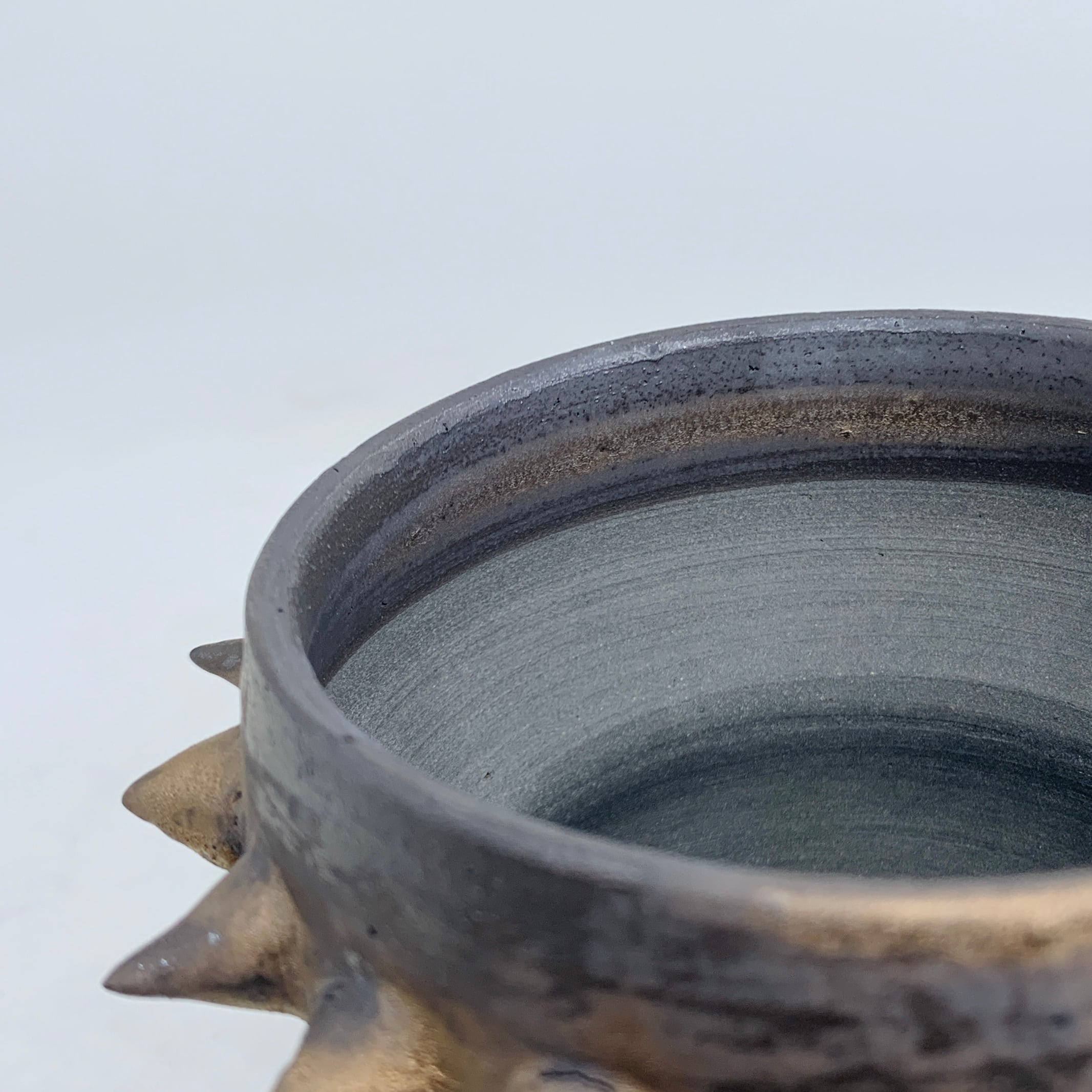 落花生の鞘(さや)にトゲが一列並んだような、茶系の植木鉢です。