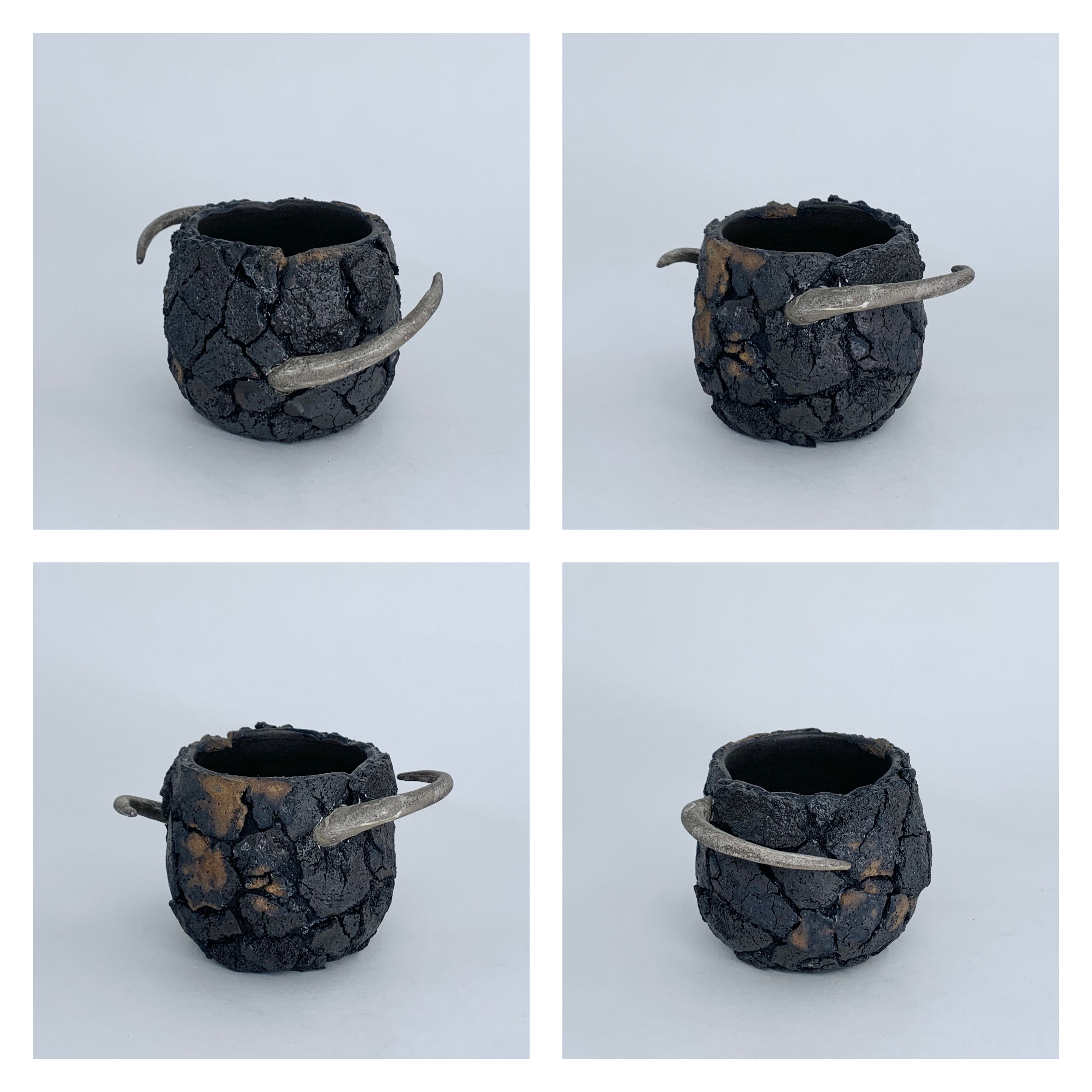 ゴツゴツとした質感の鉢に、2本のトゲが生えた植木鉢です。