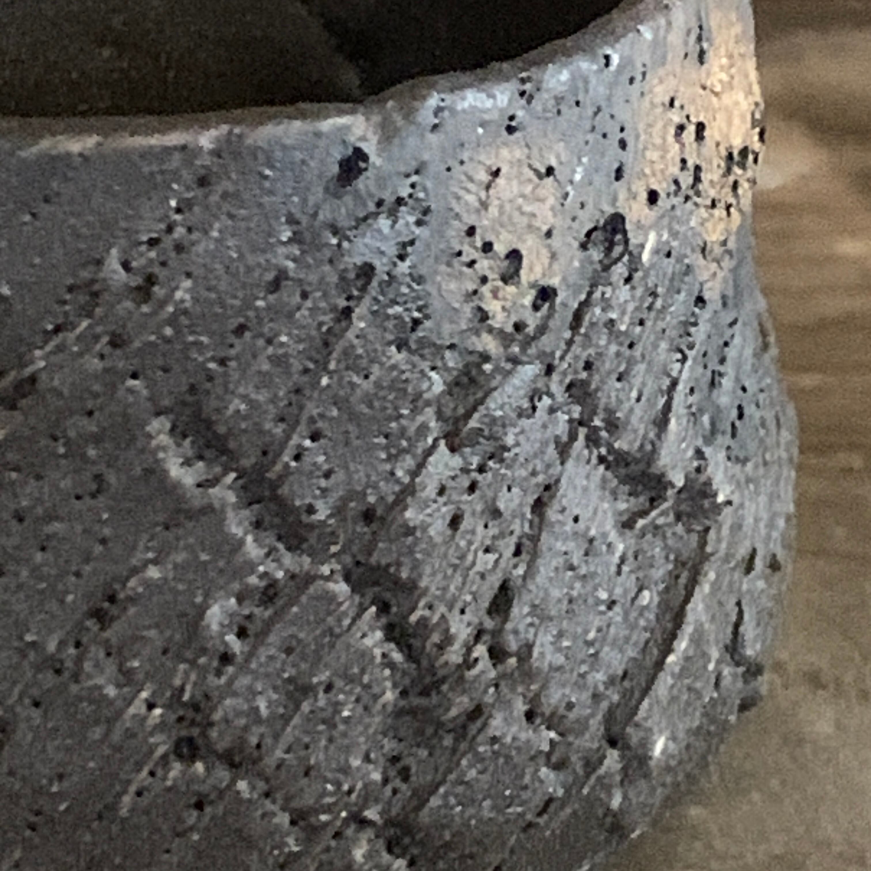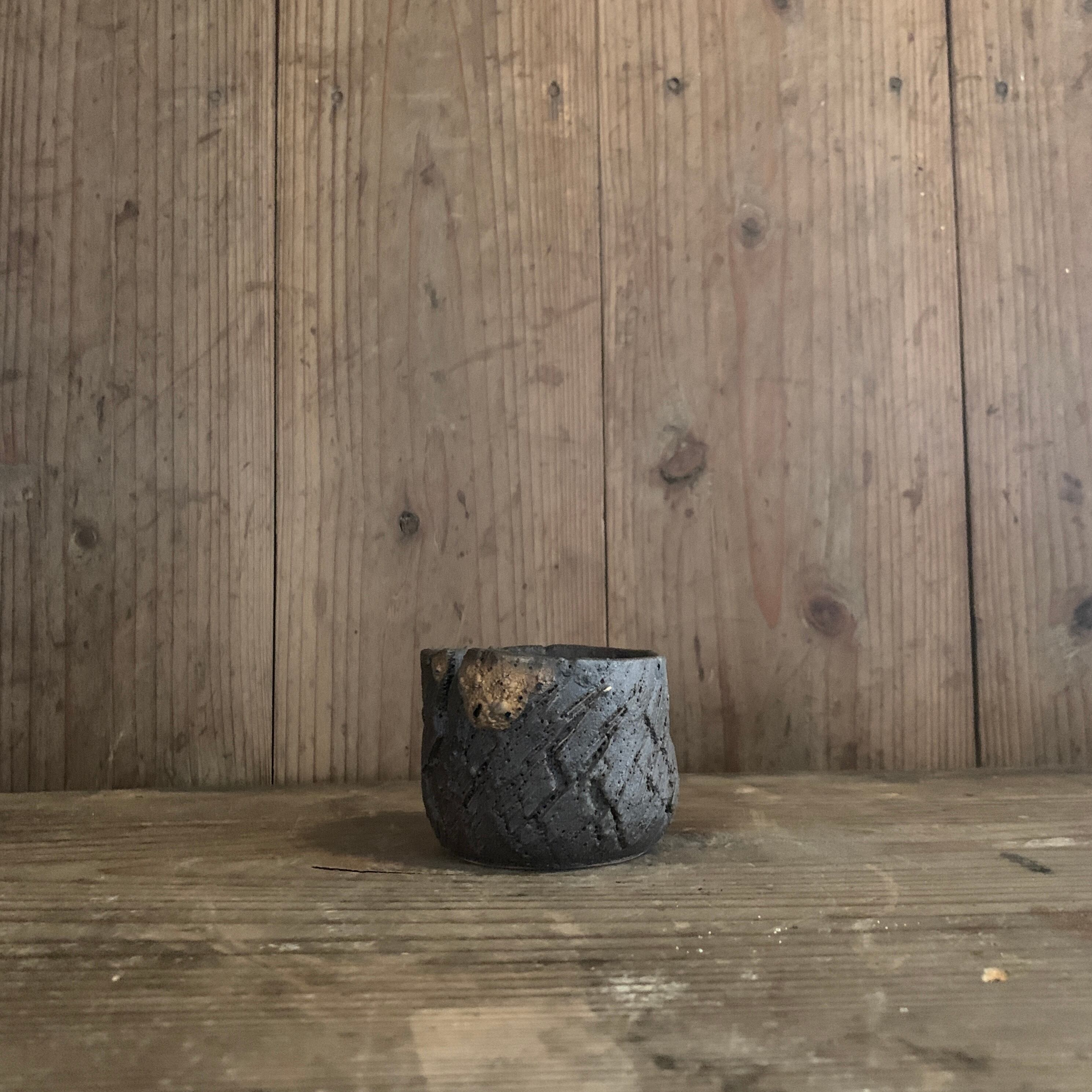 ベースは炭黒の発泡釉で、口辺部分にブロンズ色のポイントがあります。